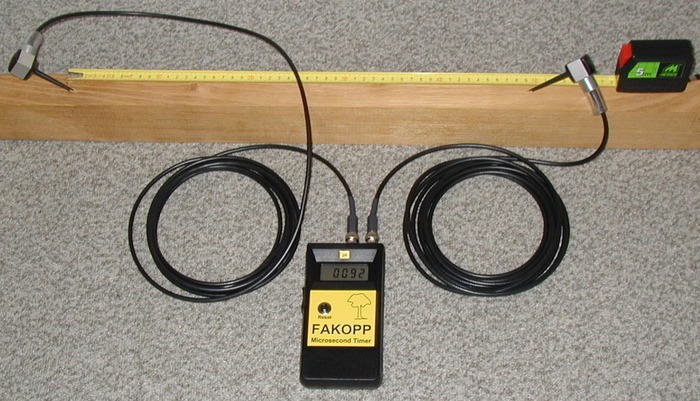 Fakkop微秒計設(shè)計用于測量樹木或木材中應(yīng)力波的傳播時間。通過錘擊觸發(fā)傳感器產(chǎn)生信號,然后由主機(jī)顯示所測量的傳播時間。通過測量兩個傳感器之間的距離,可以計算出速度,用來檢測兩個傳感器之間隱藏的腐朽區(qū)域或孔洞,或者預(yù)測材料的剛度。